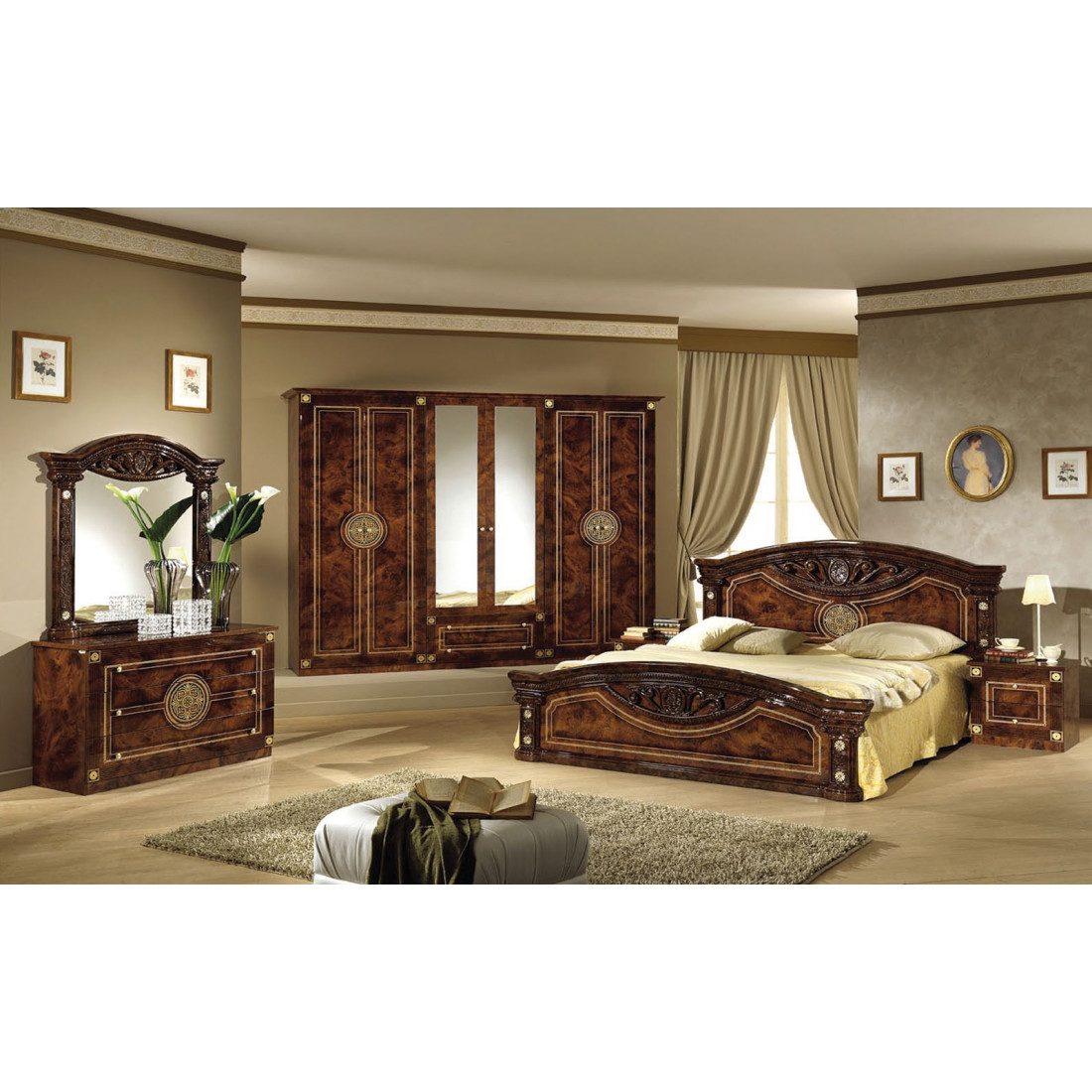 Спальня Рома (орех) композиция 2 от Российской фабрики «ДИА мебель» выполнена в строгом, классическом стиле. Ореховый цвет в сочетании с глянцевым покрытием придает элегантность. Такая спальня поможет Вам окунуться в атмосферу роскоши и комфорта. Большой шестистворчатый шкаф поможет с пользой заполнить место. Безшумные и плавно закрывающиеся дверцы шкафа и комода помогут с легкостью забыть о шуме по утрам. Вся коллекция "Рома" предназначена только для истинных ценителей элегантного классического стиля.